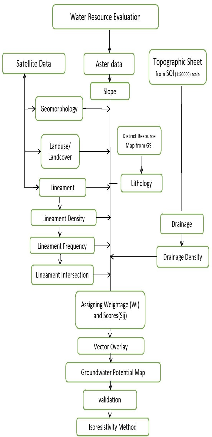 The vector overlay technique is very effective in spatial modeling of identifying groundwater potential zones. This is further validated by geophysical investigations in that area. The groundwater controlling parameters like geology, geomorphology, slope, land use, and structure and lineament is integrated and probable water potential zones are identified by rank and weightage method in the present study. The highest weightage 10 is given to the lithology, followed by geomorphology. In crystalline terrains, the aquifer characters are mainly imparted by lineaments. So, the lineament derived themes, viz: the lineament density, lineament frequency, and lineament intersection are given importance and equal weightage. The output is validated with multi iso resistivity data and a water potential zone map is prepared.
