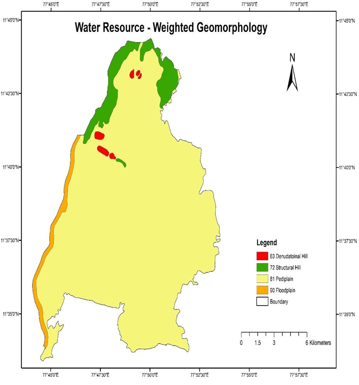 Hydro geomorphology was used by authors such as József (1999); Sankar (2002); Sikdar, Chakraborty, Adhya, and Paul (2004); Gopinath and Seralathan (2004); (Sujarose & Krishnan, 2009); Murugesan, Krishnaraj, Kannusamy, Selvaraj, and Subramanya (2011) to delineate water potential areas. The predominant terrain in the study region is plains, as shown by Pediplain and hills. As a result, the geomorphology is given a weightage (Wi) of 9.