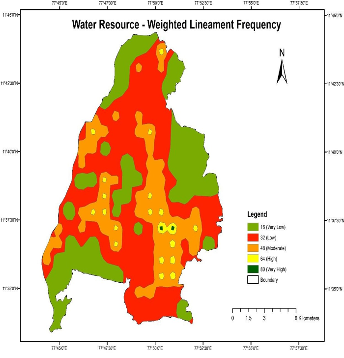 The weighted lineament frequency map is created by counting the number of lineaments per 1x1 sq. km grid and assigning weighted values to each lineament (Table 1, Figure 6).