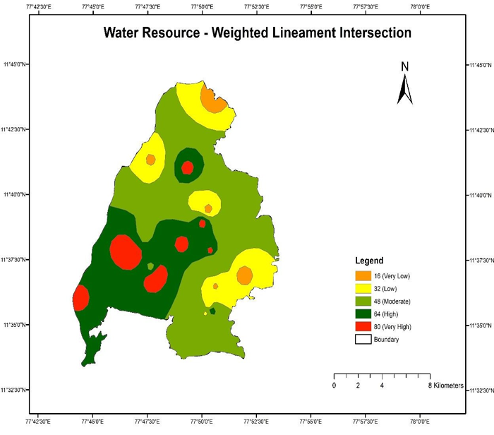 Ramasamy (1987) has combined regional spatial information of transmissivity, permeability, and storage coefficient values and concluded that groundwater flow in the area south of Cauvery is controlled by folded systems, whereas groundwater flow in the northern area is controlled by fracture systems. Lineament-related features such as density, frequency, and intersection are given a weightage (Wi) value of 8 as a result.