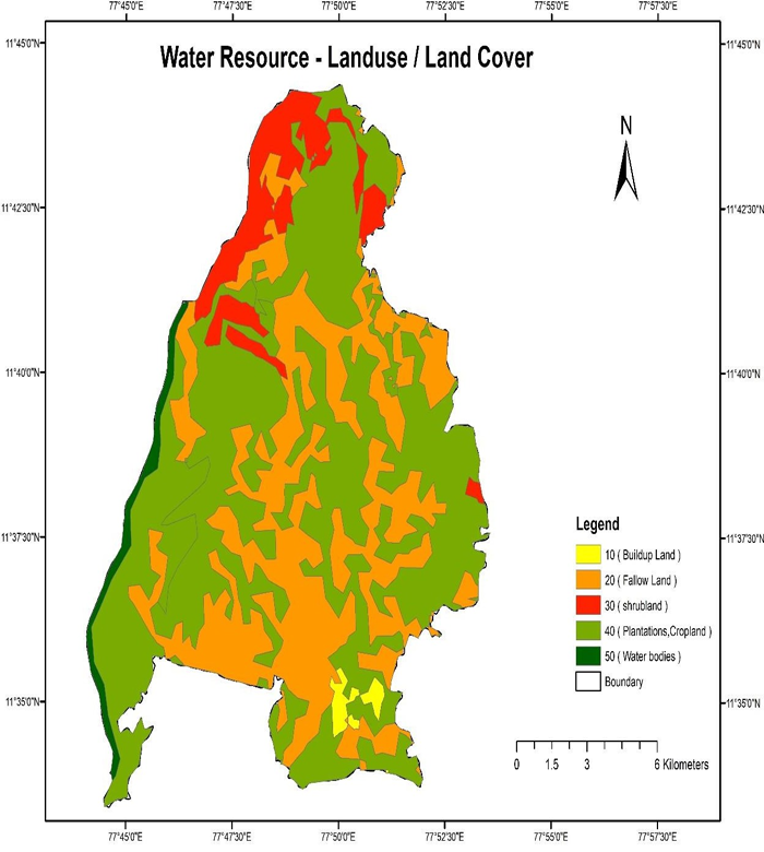 The various land-use groups delineated include Water Bodies, Plantations, Cropland, Shrubland, Fallow Land, and Buildup Land, and traditional methods of visual representation are used to identify and understand the land use pattern of the region. Each land use and land cover group is allocated weightage scores Table 1, and weighted land use and land cover chart is created as a result Figure 10.