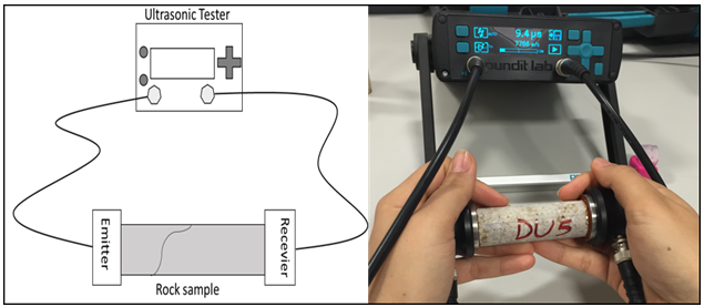 The pundit lab pulse generator unit control and two transducers of diameter 25.4 mm and frequency 250 kHz were used to test the core samples under dry condition (laboratory condition) with reference to Brown (1981) or ASTM Standard (1978) standards, in order to control the environmental factors such as temperature, moisture and humidity that affect the ultrasonic index value (Brown, 1981). The surface area under each transducer should be sufficiently plane to provide a good coupling as suggested by ISRM standard (Brown, 1981). The lateral minimum dimension is recommended by ISRM should not be less than 10 times the wave length. On the other hand, the ASTM standard specifies that the lateral minimum dimension should be at least 5 times the wave length (ASTM Standard, 1978). Consequently, the true dilational wave velocity can be measured. As the Proceq, which is the manufacturer of the pundit lab pulse generator, states, the minimum lateral dimension is 15 mm. In the study, the minimum lateral diameter of the sample is 25.4 mm and the minimum vertical sample length is 40.9 mm, which would be adequate for ASTM Standard (1978) rather than (Brown, 1981) standard. The other important factor affecting the ultrasonic velocity is the average grain size of the rock. Both ISRM and ASTM standards suggest that the travel distance of the pulse though the rock should be at least 10 times the average grain size so that an accurate average propagation velocity could be determined. The rock used in this study is limestone, which has a fine grain size and satisfy the standards.
