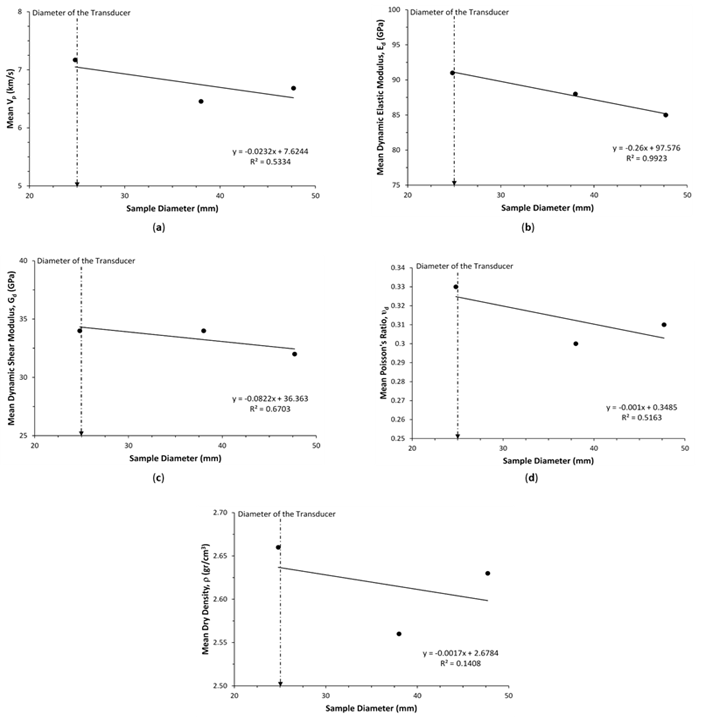 The respective relations between the sample diameter and the mean Vp, the mean Ed, the mean Gd, the mean υd and the mean ρ are shown in Fig. 5a, b, c, d, e. Fig. 5a, c and d indicate that there is a weak correlation between the sample diameter and the mean Vp, the mean Gd, the mean υd. Fig. 5b indicative of very strong relationships between the sample diameter and the mean Ed. Fig. 5e illustrates that there is a very weak correlation between the sample diameter and the mean ρ of the samples.Table-1. Physical and mechanical properties of Upper Dammam limestone