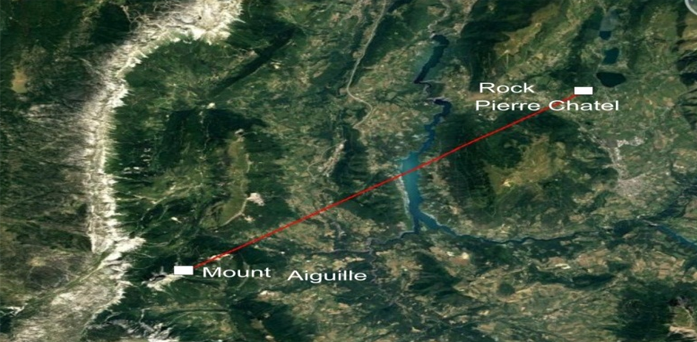 Fig-2. Line of solstice sight, connecting Rock Pierre-Chatel and Mount Aiguille, the Google satellite image