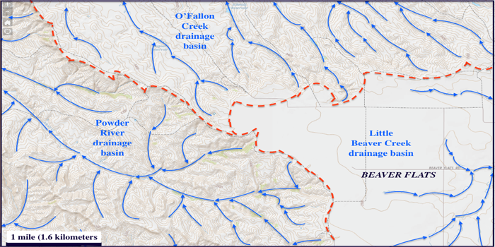 Figure-2. Map showing the triple drainage divide where the Powder River, Yellowstone River (O’Fallon Creek), and Little Missouri River (Little Beaver Creek) drainage basins meet. Blue arrows emphasize drainage routes and directions and dashed red lines show major drainage divide locations. The contour interval is 20 feet (6 meters).