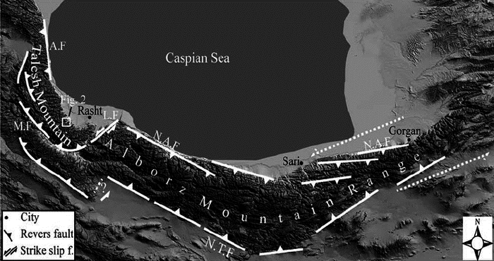 Fig-1. Location of the Alborz mountain range between Caspian Sea and central Iranian block.