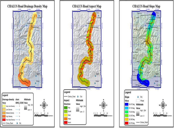 Fig-5. Drainage density, Aspect and Slope maps of Chalus road (Obtained from DEM and processed with GIS)