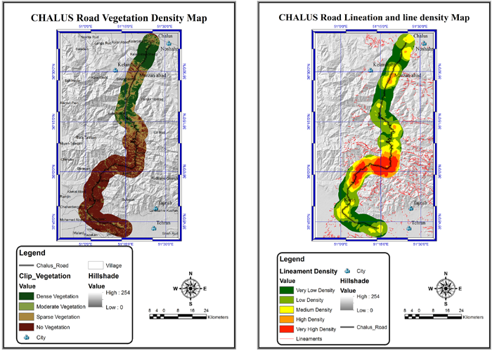 Fig-6. Vegetation Density and Lineaments and Line Density of Chalus rout (obtained from satellite imagery)