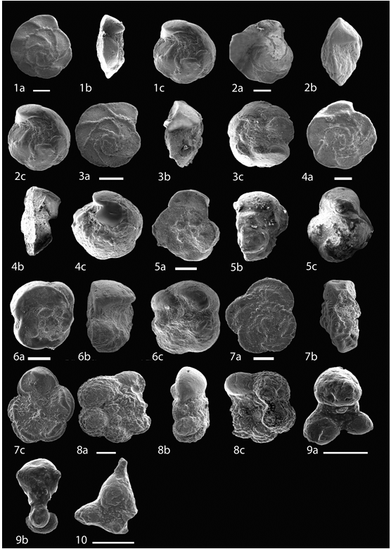 1a,b,c- Globotruncanita stuarti; 2a,b,c- Globotruncanita stuartiformis; 3a,b,c- Globotruncanita stuartiformis; 4a,b,c-Gansserina wiedenmayeri; 5a,b,c- Gansserina gansseri ; 6a,b,c- Gansserina gansseri; 7a,b,c- Abathomphalus mayaroensis; 8a,b- Trinitella scotti; 9a, b- Schackoina multispinata; 10- Schackoina cenomana.