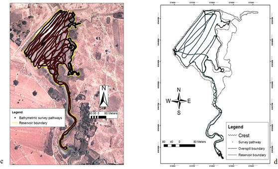 Figure-2. Bathymetric survey pathways at different water capacities: low (20/8/2015 ) (a); full (3/3/2016) (b); medium (19/6/2016) (c) and; full (17/02/2017) (d).