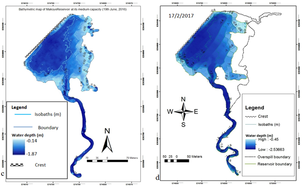 Figure-3. Bathymetry of Makoye reservoir at different seasons and capacities: warm-dry season low capacity (a), warm-wet season full capacity (b); cool-dry season medium (c) and; warm-wet season full capacity (d).
