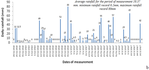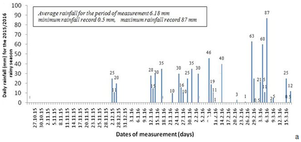 Figure 6a-b shows that during the 2015/2016 rainy season, the catchment did not receive enough rainfall (about 500 mm), which implies drought conditions. This could be attributed to the El Nino Southern Oscillation experienced during this season. Minimum daily rainfall record of 0.5 mm and, a maximum of 87 mm were recorded. The latter period shows a fair distribution of rainfall across the season as compared to the former period.