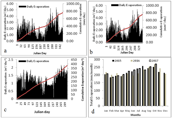 Figure-7. Actual daily evaporation and cumulative evaporation from the Makoye reservoir in the year: 2015 (a); 2016 (b); 2017 (c); and comparison of total monthly evaporation for 2015, 2016 and 2017 (d).