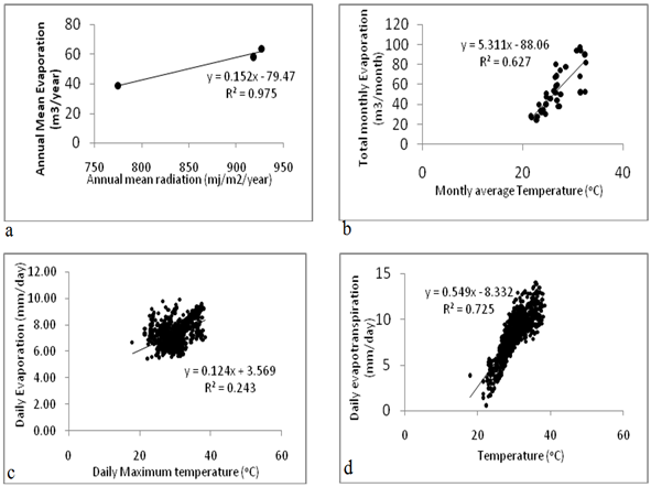 Figure-8. Relationships between: annual mean radiation and annual mean evaporation (a); monthly mean temperature and total monthly evaporation (b); daily maximum temperature and daily evaporation (c); daily maximum temperature and daily evapotranspiration (d).