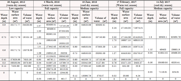 Table-2. Water depths, surface areas and volumes of water in the Makoye reservoir at different times of the year.