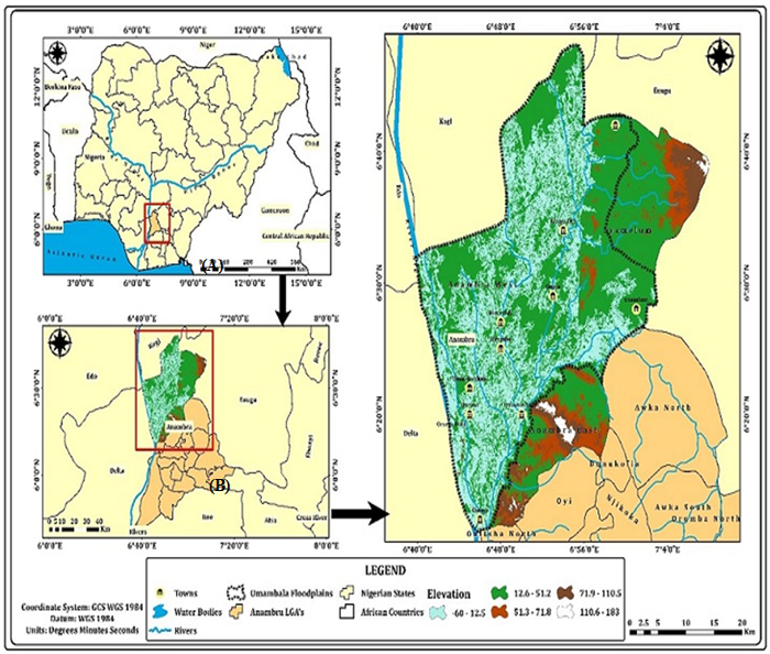 This study area encompasses three contiguous local government areas of Anambra East, Anambra West and Ayamelum. Geographically, it is located between latitude 60 401011 N and latitude 60501011 Nand longitude 60401011 and longitude 7051011 Figure 1. It has an estimated land area of 1376.49 km2.