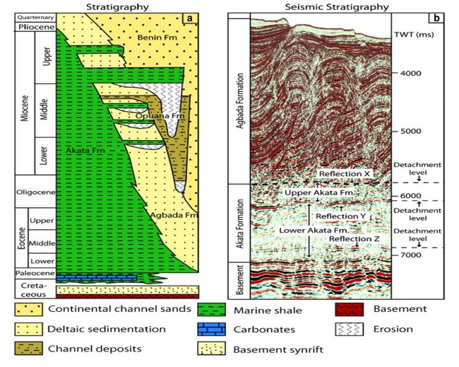 The Cenozoic Niger Delta Figure 1. covers an area of about 256,000 km2 which lies in the Gulf of Guinea in Equatorial West Africa between longitude 50E to 80E and latitude 40N to 60N (Opafunso, 2007). The Niger Delta Basin is a productive petroleum province and currently the only basin in which commercial petroleum production thrives in Nigeria. Based on the petroleum system concept, the Niger Delta has a single active petroleum system, which is the tertiary Niger Delta (Akata–Agbada) petroleum system (Opafunso, 2007). It is the youngest of the three large sediment bodies that filled the aulacogen formed after the separation of the African and South American plates. It was initially built out over a transgressive Paleocene pro-delta as river-dominated lobes which later coalesced and became high-energy, wave-dominated, and tide-influenced depo-belts. The delta grossly consists of three subsurface lithostratigraphic units Figure 2. namely the marine Akata Shale, the paralic Agbada Formation, and the continental Benin Formation. The Niger Delta is a hydrocarbon province with an ultimate recovery presently estimated at nearly 40 billion barrels of oil. This is about 70% of the overall hydrocarbon reserves of sub-Saharan Africa. The gas reserves are conservatively estimated at over 40 trillion cubic feet (Akinlua, 2012). The hydrocarbon was sourced from marine shales with land plant materials giving rise to mainly Types III and II/III organic matter within an oil window that varied in depth from 9,000 to 14,000 ft. The reservoirs are mainly shoreface, beach, channel sands bearing low sulfur/nickel, light waxy, nondegraded oils. light crude-bearing deeper reservoirs have also been substantiated in some inland blocks (York, Diego, & Francisco, 2017).