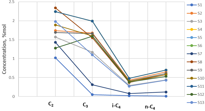 The cross-plot of iC4/nC4 against C2/C3 indicated in Figure 6 also corroborates the findings in Figure 5. According to James (1983) a comparison of carbon isotope (C1-C4) data from the individual gas components is an important tool in gas-to-gas correlations. The plot of carbon isotopic data from the 13 natural gas samples as indicated in Figure 7, shows similar patterns for 11 samples except for S1 and S7. The similarities in patterns for the 11 samples denotes that they are genetically related. This further confirms the initial findings that all the natural gases from the “X” Field of the Niger Delta are genetically related and can be classified into one genetic family. This denotes that the natural gases were generated by the same source rock. Samples S1 and S7 have molecular and isotopic compositions very different from the rest of the samples, this may be attributed to the presence of an impermeable layer within the reservoir preventing fluid communication between wells S1, S7 and the rest of the wells within the “X” Field. Dembicki-Jr (2017) indicated that the non-hydrocarbon gases ( CO2, N2, H2S) can be useful in gas-to-gas correlation. The plot of the concentration of the non-hydrocarbon gases in Figure 8 showed dissimilar patterns for all the samples. The absence of H2S may impede the use of the non-hydrocarbon gases in this study.