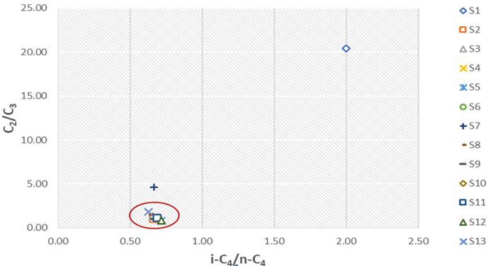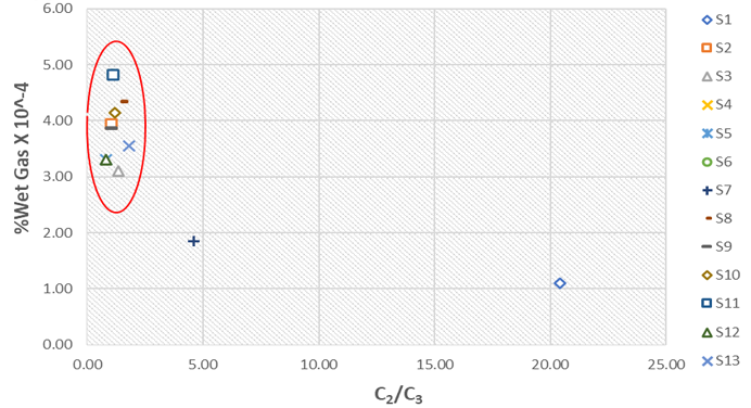 Gas-gas correlation is accomplished in several ways by comparing the composition of two or more gases. Most obvious among this is to plot the relative concentration of the hydrocarbons gases as shown in Figure 3. These direct comparisons are useful, but not always very informative. This is because natural gases are dominated by methane as shown in Table 1, making it hard to see the difference in the ethane, propane, and butanes (Dembicki-Jr., 2017). The plot of the relative composition of the hydrocarbon gases excluding methane, as shown in Figure 4 provided more insights into the difference and similarities between the natural gases than that of Figure 3. According to Dembicki-Jr (2017) cross-plot of some of the hydrocarbon gas ratios is important to illustrate similarities and differences between the gases, as indicated in Figure 5. The cross plot of C1/C2, against % wet gas ((Σ %C2–4)/(Σ %C1–4)) as indicated in Figure 5, show that 11 samples out of the 13 gas samples have similarities in chemical composition, this implies that those gases are genetically related and can be said to be have been generated by the same source rock at similar/same conditions of pressure and temperature. Sample S1 and S7 are widely spaced from the 11 other samples, this may likely be attributed to the presence of a baffle preventing communication with the other 11 wells within the reservoir.