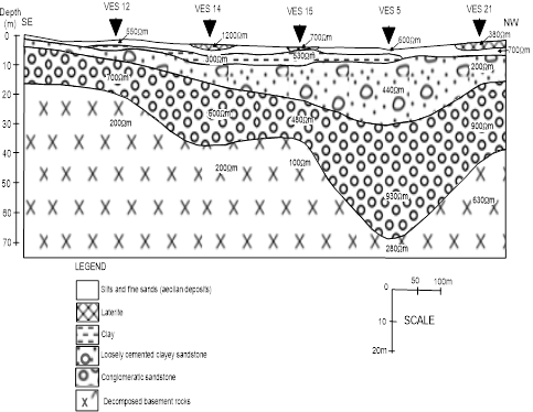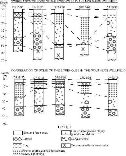 In the Daura area the lithologic sequence consists of an indurated basal conglomerate overlying the decomposed Basement Complex rocks. This basal conglomerate is overlain by loosely cemented gravelly sandstone, indurated ferruginous and clay horizons. The loosely cemented gravely sandstone, basal conglomerate and the decomposed crystalline rocks form good aquifers in the study area.
