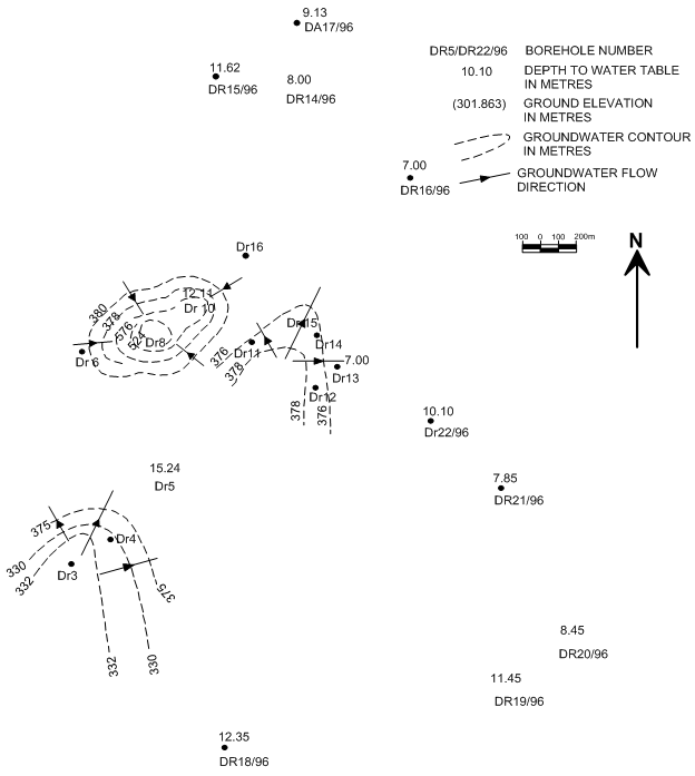 The regional groundwater flow direction is mainly northwards. Localized groundwater flow is towards the discharging boreholes and there is no evidence of borehole interference because of the wide spacing between boreholes drilled in the study area.