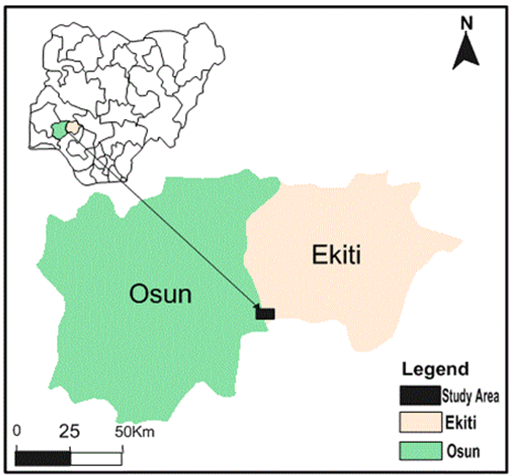 Figure 3. Map of the study area located within Ekiti and Osun States, inset: Map of Nigeria showing the study area.