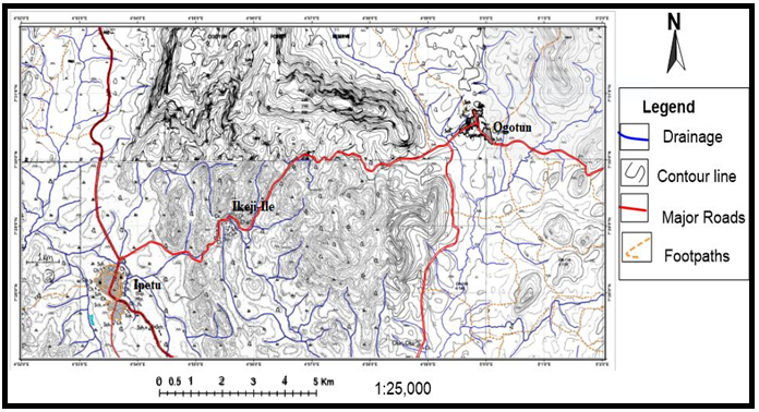 The study area lies within latitudes 07°27'N and 07°32'N and Longitudes 0 4°52'E and 0 5°2' E respectively, it covers part of Ekiti and Osun States with a total surface area of approximately 170 km2 (Figure 3). Major towns include Ogotun in Ekiti State, Ikeji-Ile and Ipetu in Osun State. The study area (Ogotun, Ikeji-Ile and Ipetu) is part of the south-eastern part of Ilesha Schist belt; Five lithologic units were identified which includes Migmatite, granite-gneiss, quartzite, quartz schist and porphyritic granites. The studied area is characterized by high relief especially those places that formed quartzite ridge, quart- schists and intrusion of batholitic granites with the highest ridge point which varies from 200m to 350m (Figure 4); other areas are characterized by presence of flood plains relative to the hills around the area. Also, there are some locations with moderate relief which is either an outcrop formed hill with the highest point over 98m.