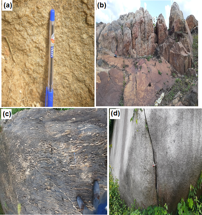 Figure 6. (a) alteration surface at Ikeji-Ile, (b) the quartz-schist at Ikeji-Ile, (c) metaconglomerate at Araromi- Ipetu and (d) porphyritic granite displaying deep fracture at Ipetu.