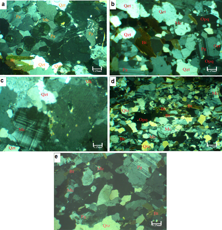The observation under the microscope revealed the presence of minerals such as biotite, plagioclase, K-feldspar, quartz and orthoclase (Figure 7e and 8e). Quartz occur as anhedral crystal with low relief and has parallel extinction in longitudinal section. Biotite occur as platy elongated high relief greenish brown subhedral crystals which is strongly pleochronic with perfect cleavage in one direction. Plagioclase occur as subhedral prismatic low relief grains. K-feldspar occur in trace amount as subhedral small lath crystals with low relief and very low extinction angle interference colour.