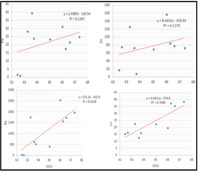 The major oxides analysed in the rock samples are SiO2, Al2O3, Fe2O3, MgO, CaO, Na2O, K2O, TiO2, P2O5, MnO and Cr2O3. The geochemical results (Table 2) shows the following ranges: SiO2 ( 67.37%-62.46%), Al2O3 ( 17.35%-11.62%), Fe2O3 (total) ( 6.44%-2.3%), MgO (3.18%-1.02%), CaO (5.04%- 0.72%), Na2O (4.1%-2.44), K2O( 6.95%-2.01%), TiO2 ( 0.96%-0.21%), P2O5 (10.02- 0.25%), MnO (0.17%- 0.07%) and Cr2O3 (<0.002- 0.012%). The result revealed that the rocks in the studied area are rich in silica, moderately rich in feldspars (Plagioclase, sodic and potassic), feldspathoids as well as being aluminosilicate in nature while other oxides such as CaO, Na2O P2O5 and TiO5 are present in minor to trace amounts in the rocks .Major oxides are regarded to as lithological index that reflects the geology of underlying rocks (Ojo, 1988).