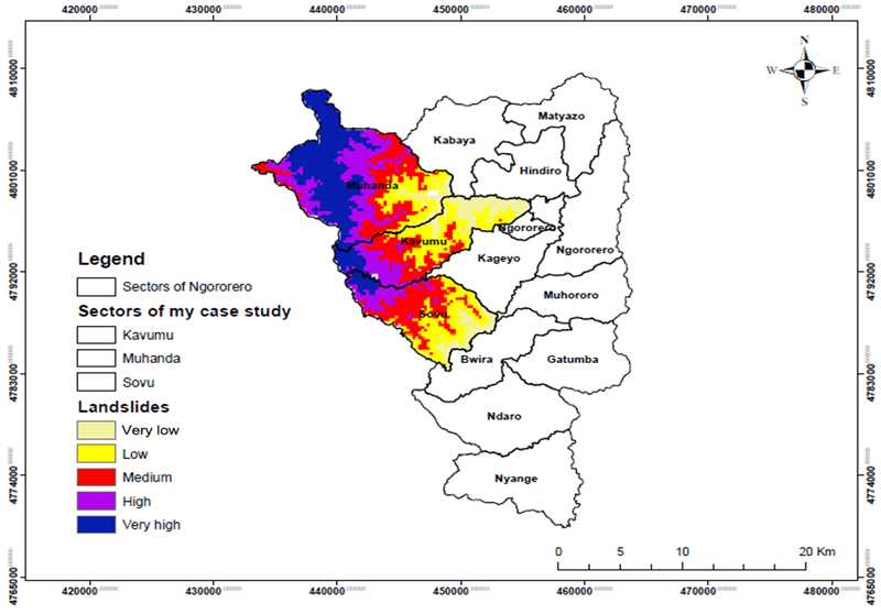 Figure 9. Landslide susceptibility in Kavumu, Muhanda and Sovu sectors 2020.
