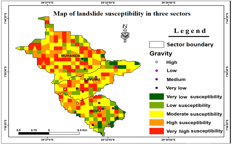 To analyze the impact of landslides on the livelihoods of rural communities in the Ngororero District, the study first began by delineating the gravity of landslides in the study area. The figure below shows the level of susceptibility to landslides in the Muhanda, Kavumu, and Sovu sectors.