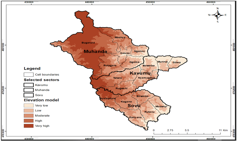 The map (Figure 5) shows that, in Muhanda Sector, the larger part of Bugarura, Mashya and a small part of Rutagara cell have elevation which is very high, while others have relatively high, moderate low and very low elevation. In Kavumu Sector, a very high and high elevation is in Tetero, Rugeshi, Nyamugeyo, Birembo and small part of Gitwa, and the remaining part are with a low and very low elevation.
