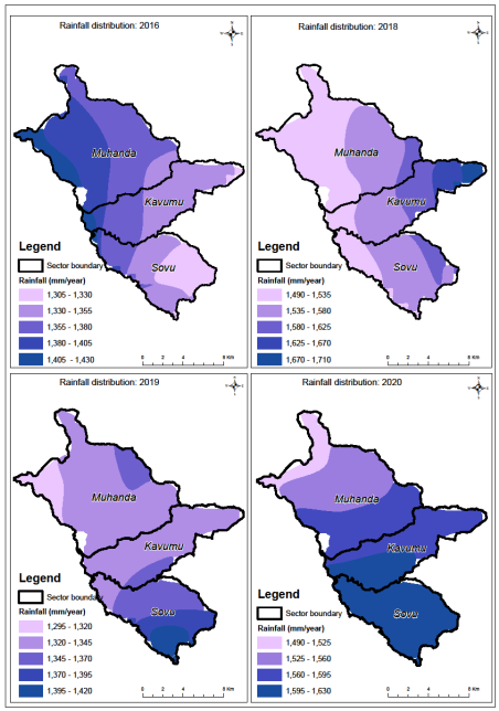 Figure 6. Rainfall distribution in Muhanda, Kavumu and Sovu Sectors from 2016 to 2020.