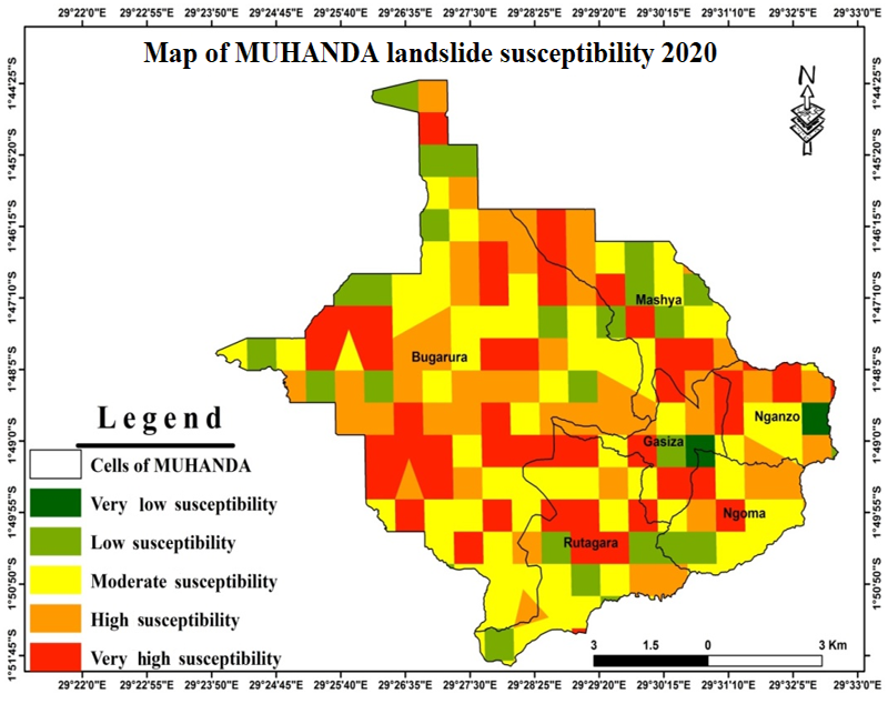 Situation of Muhanda Sector in 2020: It was noted that 26.1% of the area’s susceptible to landslides was very high, 25.9% of the area was high, 33.7% of the area was moderately susceptible to landslides, and 14.3% of Muhanda Sector was low and very low susceptible to landslide.