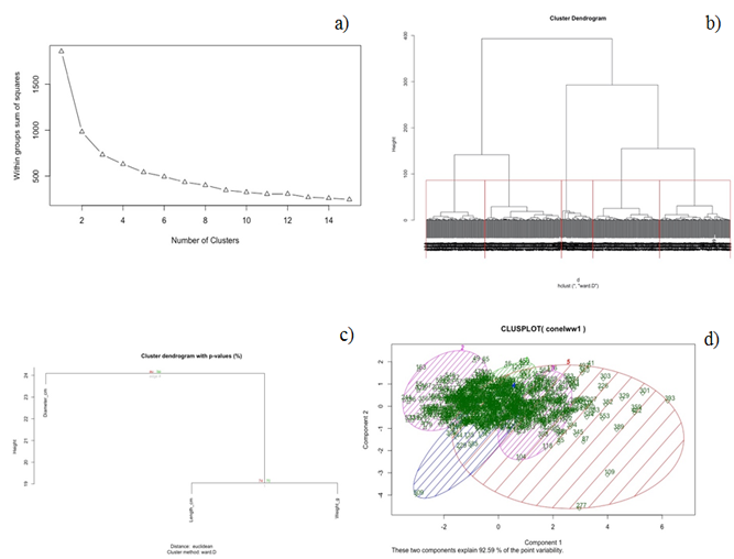 Figure-2. Within groups sums of squares (a) showing the clusters distribution, Ward distance dendrogram showing number of clusters (b), Cluster dendrogram with the P.patula cones length, Diameter and Weight showing p values (c), and Cluster plot showing the variables that account for more than 90% of the observations (d).