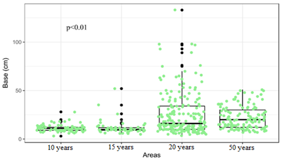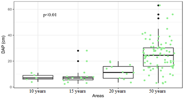 Figure 12 shows a similar effect for all parameters analyzed. Due to its size, C. nordestinum needs time to develop, mainly due to ecological succession. Newly devastated areas are expected to have grassy and herbaceous plant species. And, with the late levels of succession, even after their presence in the environment, species of shrub and arboreal size need time to develop until they obtain high DAP values, base diameter and height.