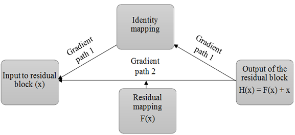 While in simple deep networks, convolutional, pooling, activation, and fully connected (FC) layers are stacked one on the other, in ResNet-50, an identity mapping is introduced between the layers. An identity mapping to the input gives the output that is the same as the input. A residual network makes use of the residual function which is the difference between the input and the output of the residual block. In Figure 5, gradient path 2 has to go through weights, while gradient path 1 doesn’t have to encounter weights. Therefore, the gradient reaches the input layer without any change in the signal from the output during backpropagation.