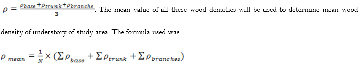 Only basic wood density was considered in this study; it was calculated using the following formula: wood density (p) = dry mass / green volume [13]. This formula concern each collected sample (base, trunk and branches of tree) for each tree. This formula is recommended for wood density determination and which could be applied for biomass estimation [27]. The wood density (p) of each tree was obtained by formula: