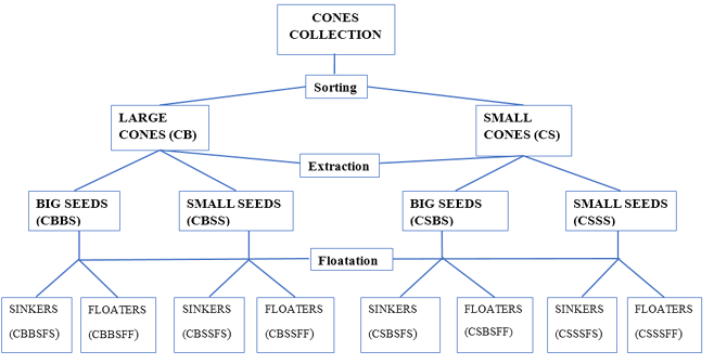 Figure-1. The experimental design diagram with the steps from cones collection up to seed extraction and floatation.