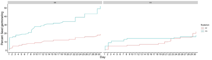 Figure-4. Percent cumulative germination of C. lusitanica seeds by seed size (SB >2mm and SS <2mm) and floatation (floaters FF and sinkers FS) in 30 days.