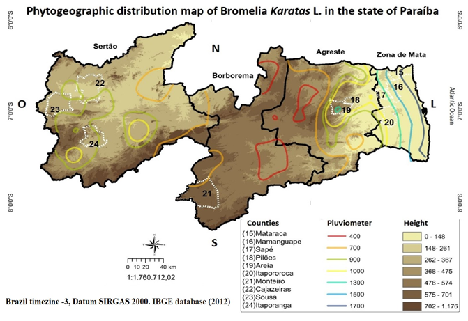 The preparation of the map took place in three phases: initially the layer of hypsometry was made; for the second layer, the isoíetas, from the points of equal pluviometric regimes, were specialized, through the database of the Executive Agency of Management of the Waters of the State of Paraíba AESA; and finally the third in the third layer, were specialized municipalities that responded to the phytogeography of the Bromelias studied. The shepefile, municipalities, is also part of the AESA database.