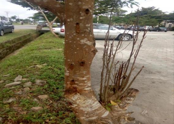 To enumerate A. terebrans opened tunnels (Figures 2 and 3) in T. mantaly, a total enumeration method was used across the 3 Parks of UNIPORT during the 6-months (January-July) field survey in 2018. All T. mantaly trees were closely assessed visually for the presence and absence of tunnels, frass and exudates. The Diameter Breast Height (DBH) of the trees was measured and recorded.