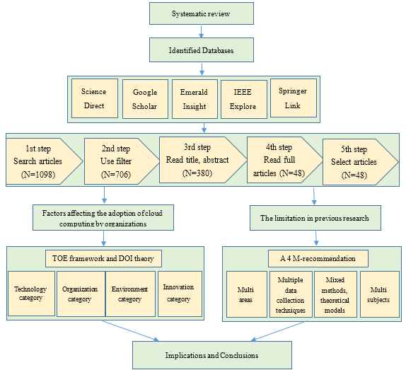 In the theoretical model, each of the research theories deals in-depth with certain aspects, for example, TOE refers to three factors (technological, organizational, and environmental), while DOI does not address environmental factors. Some previous studies used combinations of theoretical models such as Oliveira, et al. [31] based their study on DOI-TOE to explore factors affecting the decision to apply cloud computing, 369 responses from firms in manufacturing and services sectors in Portugal were received. Tehrani and Shirazi [65] based on DOI theory, TOE framework and analysis data from 101 decision makers in North American illustrated that the most important factor affecting the enterprise’s decision to adopt cloud computing is the understanding of cloud computing by top management. Gangwar, et al. [3] used TAM, TOE and collected data from 280 information technology companies in India to understand the determinants of cloud computing adoption. Tella, et al. [88] used the unified theory of acceptance and utilization of technology (UTAUT) and TAM to show the factors impacting the adoption of cloud computing for online services in Nigerian educational libraries. Therefore, future studies should consider selecting suitable theoretical models that can combine to be applied in the same study.