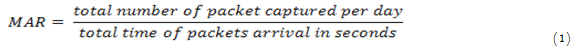 a. Arrival Rate is the rate at which packets arrive at an intermediate node from a source and these packets arrives at time intervals. For the purpose of this research, the arrival rate of packets captured was set to packets per second. For instance, there can be up to 600 packets arriving at the intermediate node per second due to high signal strength. However, loss or low signal strength can disrupt data capturing as it causes delay and un-orderly arrival of packets that is, when the number of packets that arrives within one second is displayed, the next arrivals might be after 10 seconds, then 15 seconds and keep increasing. Thereafter, the Mean Arrival Rate (MAR) of packets for each day was computed as shown in Equation 1 .Service Rate is obtained after the service time is determined. It is the time it takes for a packet to be processed by its intermediate node before transmission to its destination. The service time for each conversation is determined by Equation 2.