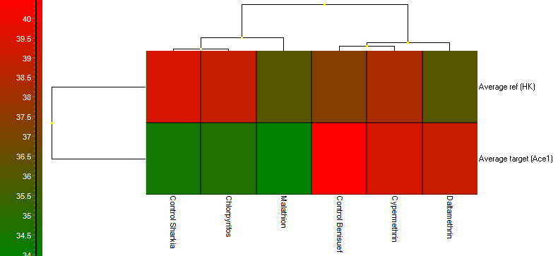 The Pink Bollworm Pectinophora gossypiella (Saunders) is a devastating pest in Egyptian cotton field. Insecticide control failure may be happen due to its biological features of hide inside bolls and rarely exposed to insecticide application. Thus, a bulk of bolls infested with larvae collected from fields of Sharkia and Benysuef governorate. Moreover, exposed to py, Op sub lethal concentrations in laboratory bioassay. Toxicity features as LC50, LC90 and the slope, and RR was completed. Whereas the common target site of OP and pyrethroid is the acetylcholinesterase enzyme. Thus, the gene Ace1 encoding AChE relative expression was investigated using molecular marker of real-time PCR procedures via the steps of generating data was RNA isolation and characterization, cDNA synthesis, then generating normalization factors, and Ct data attained and analyzed using 2-ΔΔCT method to quantify the gene expression quantitatively of insecticide treated larvae tissue extracted. Data showed the most expressed ratio of samples was cypermethrin followed by deltamethrin compared with the control and the least was malathion and chlorpyrifos, thus, the most effective insecticide was malathion and the least were cypermethrin according to ct values. Hierarchical clustering combined with Heat map and principle component analysis based on various clustering systems and algorithm as distance measures were completed. Validation of reference gene in addition to gene expression stability analyzed by the three optimal gene finders and showed that deltamethrin and cypermethrin treated genes having lower mean weights and considered transcriptionally stable and ideal reference genes.