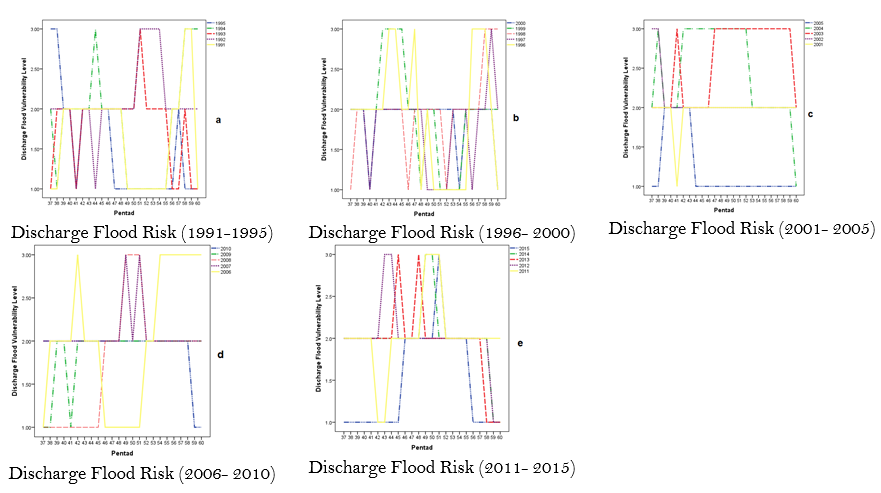 The 1990s discharge levels show dominance of low and moderate discharge with less consistency of higher discharge (Figures 8a and b) as high discharge were consistent for three and four pentads in 1992 and1999 respectively. The consistency of moderate and high discharge was intensified between 2000 and 2004; high discharge persisted between 46 – 59th pentads in 2003 and 42 – 52nd in 2004 (Figure 8c). The peak flood risk for 2005-2009 was characterized by variability across the pentads which will definitely minimize downstream flood (Figure 8d).