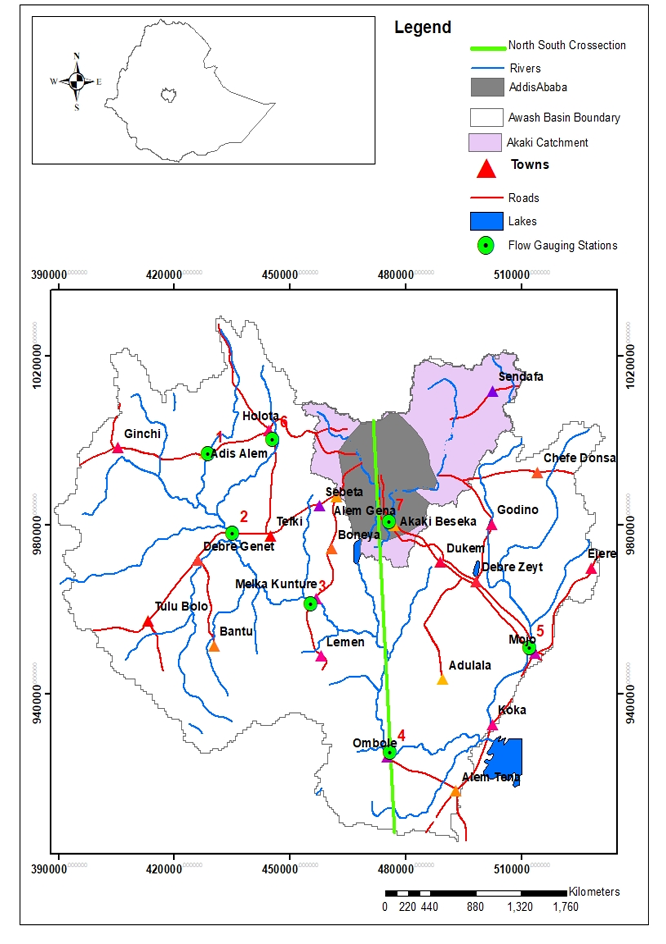 The Upper Awash River Basin is located in central Ethiopia on the western edge of the Main Ethiopian Rift (MER). The basin is the most densely populated and industrialized regions of the country. It has emerging towns as well as small, medium and large cities. Ginchi, Holeta, Addis Alem, Olonkomi, Burau, Legetafo-Legedadi, Sendafa, Sebeta, Asgori, Teji, Tefki, Bishoftu, Dukem, Tole, Tulu Bolo and Mojo are some of the small and medium towns which have 15,000 to 100,000 inhabitants. The biggest urban center in the basin is the capital Addis Ababa City and the seat of the African Union hosting around 4,794,000 people [1]. The Akaki Catchment is situated to the north east of the Upper Awash basin and it is the place where Addis Ababa city is located.