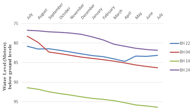 This groundwater evolution is shown below in Figure 3. The water level changes between 1990 and 2000 was less than 1 meter as there was no pumping of water in the wellfield. Even the level changes were minimal until 2009. Because until this time, daily abstraction in the well field was less than 40,000 m3 per day. This discharge amount was in line with the maximum allowed safe yield from BCEOM–- SEURECA SPACE JV [6] modelling result.