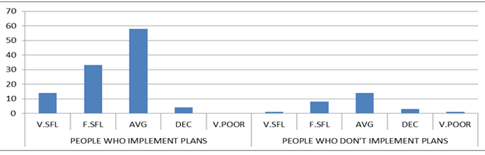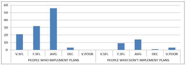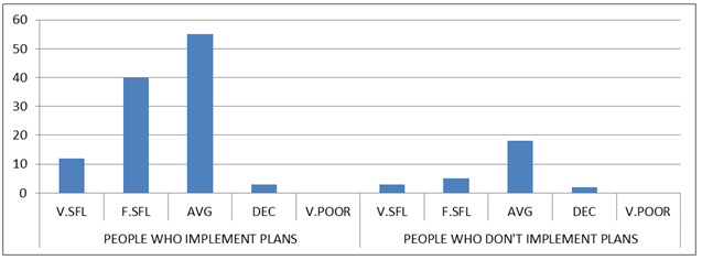 The micro enterprises that had not implemented their business plans described themselves as follows: The very successful were 3(2%), the fairly successful were 5(4%) and the average in success were 18(13%) in terms of profit rating. Two (2) entrepreneurs or 1% among those who had not implemented their business plans reported declining profits. Plans implementation versus profits analysis is in Table2 and Figure 4